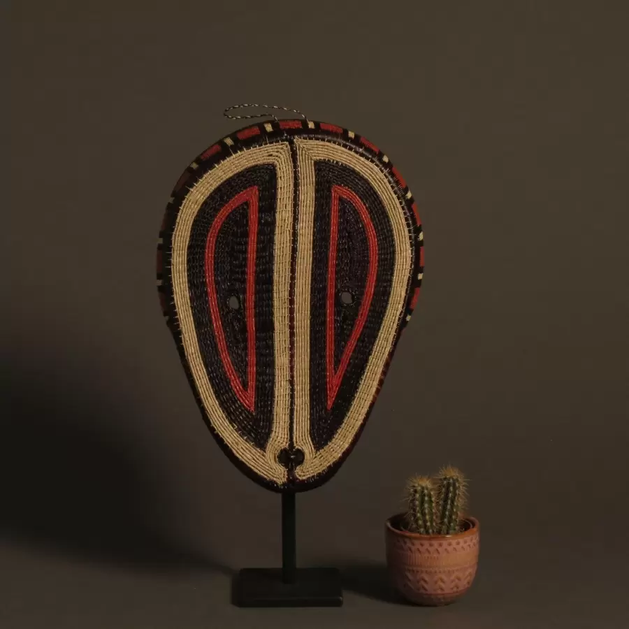 Estas máscaras se fabrican por las mujeres  en el corazón de la jungla.. Se recogen las palmas, luego se secan, se blanquean al sol y se tiñen con tintes vegetales. Empieza luego un fabulosos trabajo de creación que requiere a la vez un gran sentido del arte y un "savoir faire" incomparable, detenido únicamente por las mujeres de la tribu.